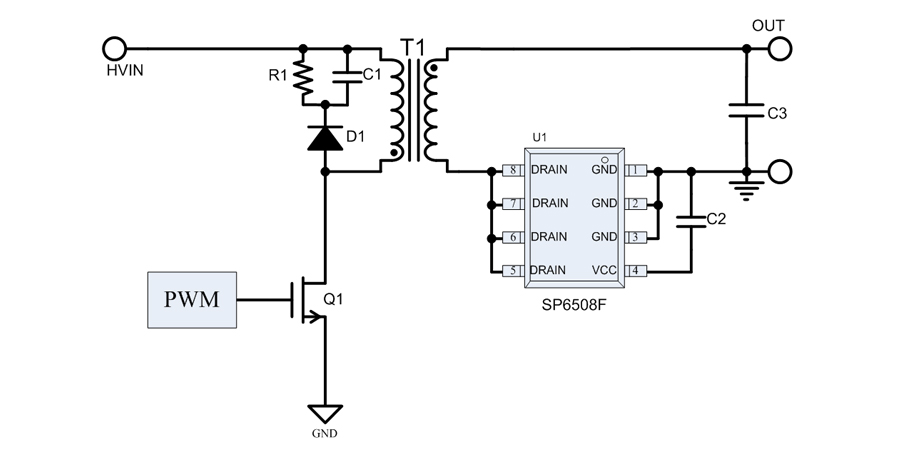 SP6508F是一顆應用于隔離反激電源系統的次級同步整流芯片。通過模擬次級肖特基整流二極管的工作并以極低的導通電阻來減小損耗。SP6508F可以工作在斷續模式(DCM)和準諧振模式(QR)。使用先進的消隱技術使得芯片在各種工作模式下可以穩定可靠地工作。